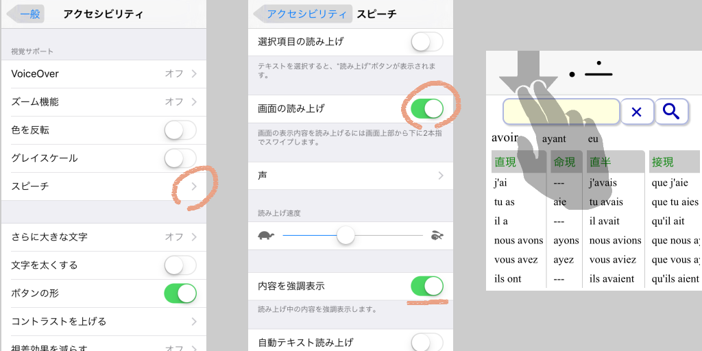 - 一度設定すればあらゆる対応アプリ上で読み上げが機能します。Conju 6の場合は読み上げ表示モードで不定詞を検索して、2本指でスワイプ、がベストです。